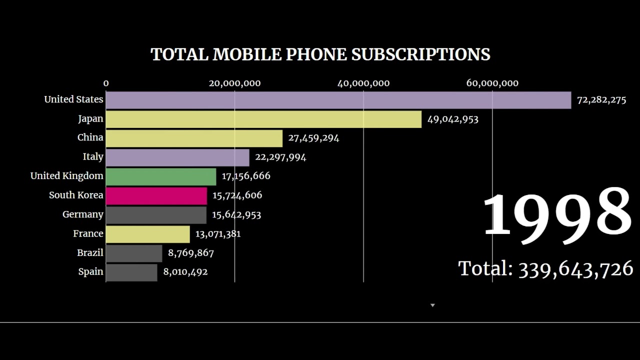 Two minutes of dynamic graphics to entertain, with 100% real information, below I will put the source where I got this data. Description: Mobile cellular telephone subscriptions are subscriptions to a public mobile telephone service that provide access to the PSTN using cellular technology. The indicator includes ( and is split into ) the number of postpaid subscription, and the number of active prepaid accounts ( i.e. that have been used during the last three months). The indicator applies to all mobile cellular subscriptions that offer voice communications. It excludes subscriptions via data cards or USB modems, subscription to public mobile data services, private trunked mobile radio, telepoint, radio paging and telemetry services.