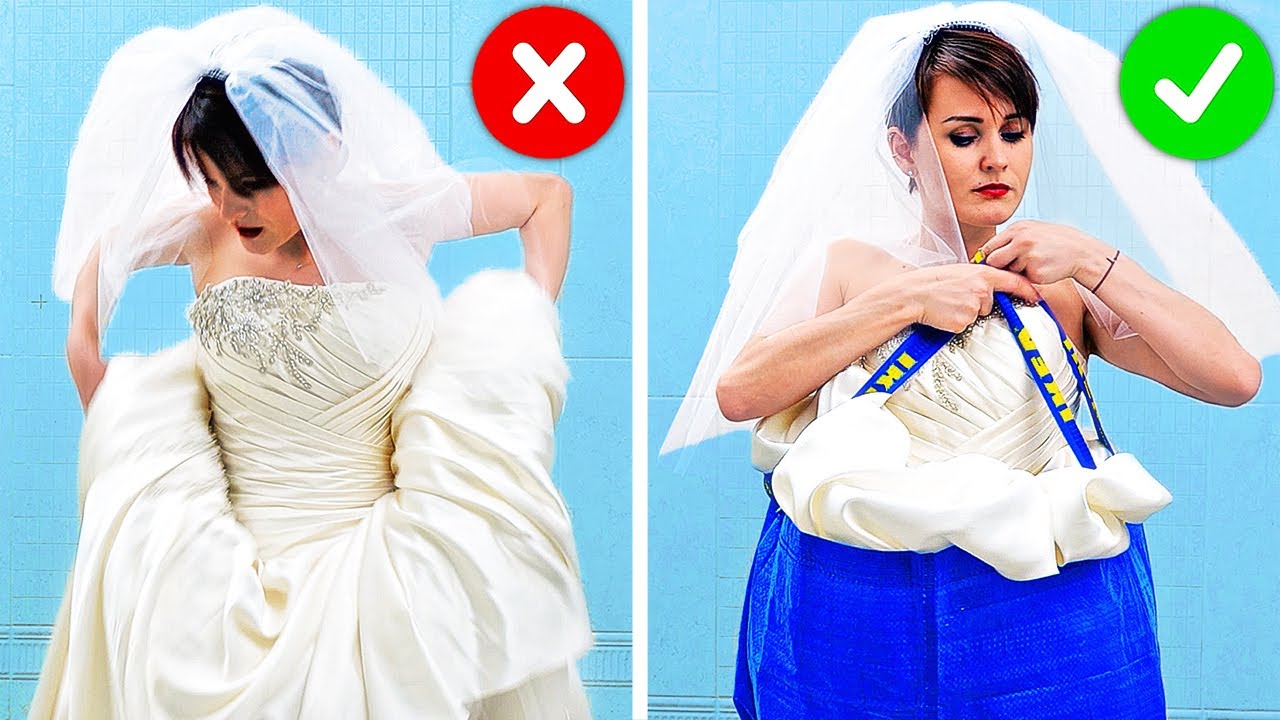 Brides would use a large IKEA bag, pierce a large at the bottom of it so that they can go to the bathroom without any difficulty.