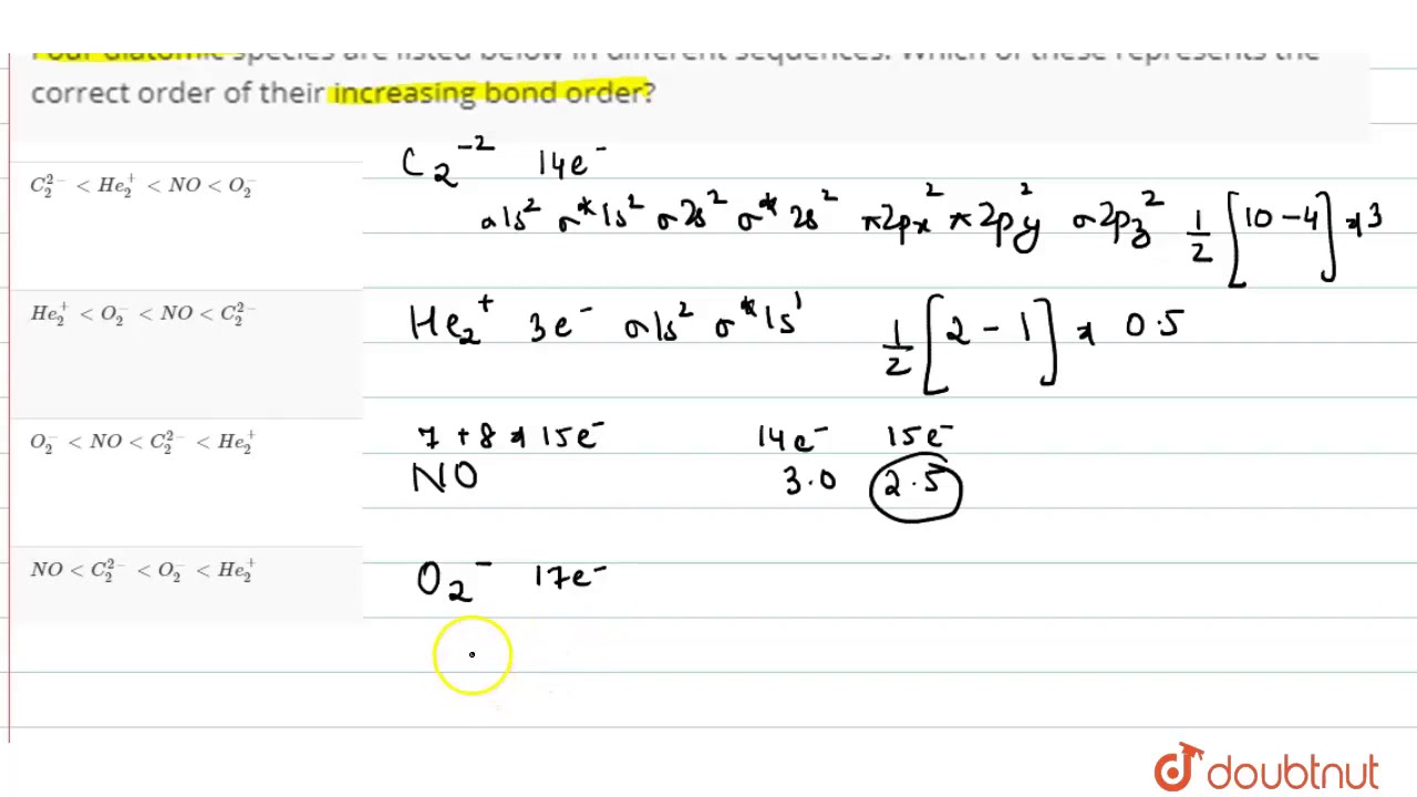 Four diatomic species are listed below in different sequences. Which of these represents the correct order of their increasing bond order?